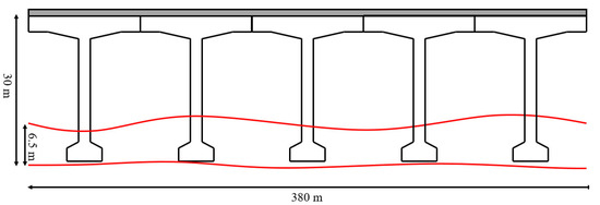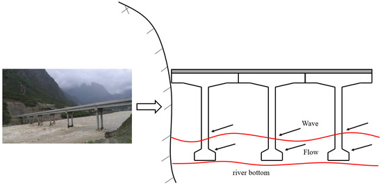 The water wave theory uses the laws of fluid mechanics to reveal the essence of water wave motion, which requires the establishment of basic control equations suitable for fluid motion. The layout plan of a bridge is shown in Figure 1. In this paper, for gravity waves, the fluid is assumed to be incompressible, of constant density and non-viscous [9].