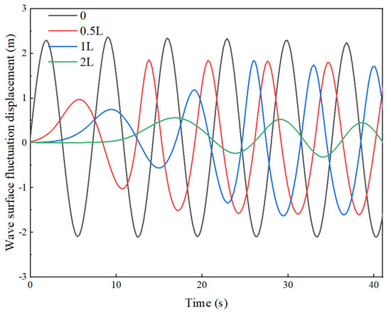 In order to further observe the attenuation of wave height in the wave simulation, the “Model Point” is defined at 0, 0.5 L, L and 2 L (in which L is the wavelength) from the incident boundary on the free liquid surface, and the time course curve of the wave displacement is obtained at the corresponding points. Figure 4 shows the fluctuation displacement time curve of each point. From the figure, it can be considered that the farther away from the wave source, the sparser the grid division becomes in the course of wave propagation, and the attenuation of the wave peaks at the free floor points becomes particularly apparent. It can be considered that the degree of wave peak attenuation is extensively associated with the measurement of the grid density in the course of wave propagation (i.e., the x-direction of this model).