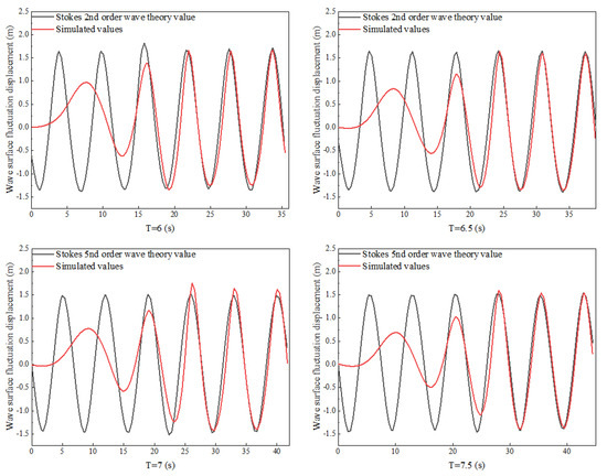 Based on the Stokes2-order wave theory and the Stokes5-order wave theory, the wavelengths of a Stokes2-order wave and a Stokes5-order wave and the theoretical front wave displacement at a double wavelength (L) are solved via Matlab 2016b programming. The theoretical wave displacement is compared with the above numerical and modular values to verify the simulation effect of the wave. The results of the comparison are shown in Figure 5. It can be seen from the comparison of the figures that when the wave fully develops and reaches stability, the simulated wave front wave displacement modulus is in good agreement with the theoretical value obtained for different wave periods, indicating that the three-dimensional numerical flume can simulate a more ideal wave.