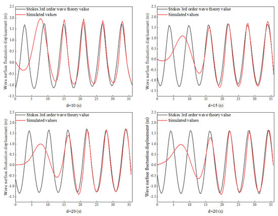 Based on Stokes’s third-order wave theory, the wave surface fluctuation displacement times at the wavelength and doubled wavelength (L) of Stokes’s third-order wave are obtained via MATLAB programming, and the theoretical wave surface fluctuation displacement time is compared with the numerical mode value of the 3D wave simulated by the sink. The comparison results are shown in Figure 6. It can be observed from the comparison graph that when the waves are fully developed and stabilized, the simulated 3D numerical wave surface fluctuation displacement values are in good agreement with the theoretical values, especially at a water depth of 20 m.