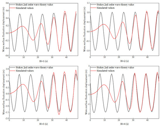 Limited by the insufficient water depth in the first two subsections, wave heights with a larger range of variation could not be simulated. Therefore, the wave parameters in this section are selected as follows: a period of 6.0 s, a water depth of 50 m, and wave heights of 1.0, 2.0, 3.0 and 4.0 m. The values of d and H corresponding to the waves at different wave heights are calculated, and Stokes’s second-order and third-order waves are determined in the applicable range of wave theory to describe the simulated 3D numerical waves. The relevant parameters for waves of different wave heights are shown in Table 2.
