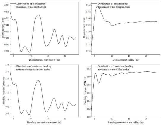 Figure 8 shows the distribution of the maximum value of the dynamic response of the pier column in different water width ranges. As can be seen from the figure, when the water on both sides of the pier column is 4 to 13 times the diameter of the pier column, the maximum value of the dynamic response of the pier column fluctuates greatly and cannot achieve a stable value. But when the width of the water on both sides of the pier column is greater than or equal to 14 times the diameter of the pier column (the data below the dashed line in the table), the dynamic response of the structure basically tends to stabilize the maximum values of the bending moment, force and displacement when the top action of the wave peak is 30.618 MN-m, 4.6833 MN and 3.490 cm or so up and down. The maximum values of the bending moment, shear force and displacement when acting at the bottom of the wave trough fluctuate up and down around 16.1140 MN-m, −2.7403 MN and −1.587 cm, respectively, and their fluctuation amplitudes are within the acceptable range [25]. As the excessive water body range will substantially increase the calculation time, taking into account the model’s calculation efficiency and accuracy factors, the width of the water body on both sides of the pier is taken to be 14 times its diameter in the subsequent coupled analysis of the pier and wave flow and solid coupling.