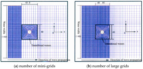 In the numerical simulation of a wave–bridge pier for fluid–structure coupling, the pier cross-section size is small relative to the water length (4 L), and the waveform is not affected when the water length is taken to be 4 L. However, the pier’s cross-sectional size is not negligible with respect to the width of the water, and it will affect the wave crest line or trough line due to the blockage of the pier. For this reason, this section discusses the modeling details such as the width of the water column around the pier and the mesh size for the numerical simulation of a wave and bridge pier in fluid–structure coupling.