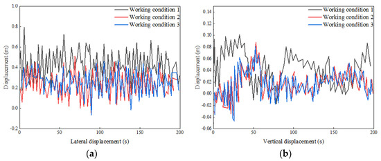 From Figure 10a, it can be seen that the displacement response to the three operating conditions varies randomly with the time of the wind, wave and flow loads. The displacement amplitude is relatively larger in Case 1 with the wind as the main load, followed by Case 2 with a wave as the main load, and the amplitude is relatively small in Case 3, which took water as the main load. This is due to the fact that the wind load acts directly on the main girders, and according to the characteristics of the bridge, a wind speed point is placed every 6 m, and there are 198 wind speed points on the whole bridge; therefore, the wind load has a more obvious effect on the mid-span transverse displacement. In a 200 s load duration, the maximum values of the transverse displacement in the span are 0.84, 0.63 and 0.62 for cases 1, 2 and 3, respectively. However, there are still large transverse displacements, indicating that the influences of the waves and water flow on the transverse displacement in the main span cannot be ignored. It is also worth noting that the transverse displacement is basically positive; this is because the water current load is loaded in the same direction as the wave load.