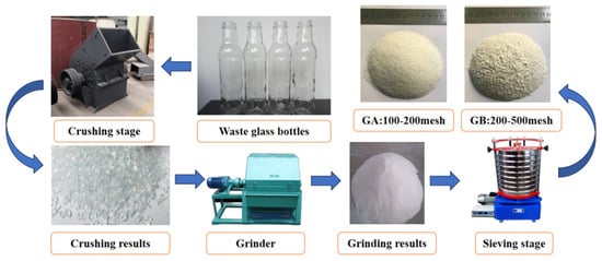 In order to obtain clean glass powder, all the glass powder used in the experiment was made from white waste glass bottles. The waste glass powder was obtained through crushing waste glass bottles with a crusher, grinding them with an SM-500 cement test double-layer sound-proof small cement steel slag ternary catalytic ball mill, and separating them using a standard vibrating pendulum instrument. The glass is ground to the desired particle size using 100 mesh, 200 mesh, and 500 mesh sieves, resulting in two different particle size ranges: 100 mesh–200 mesh and 200 mesh–500 mesh. The flow chart for making waste glass powder is shown in Figure 1, and the chemical composition of the glass powder is shown in Table 3.