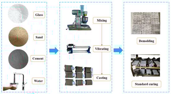 Initially, cement mortar test blocks without glass powder were prepared as a reference group (G0 group), using a standard mixing ratio of cement: standard sand: water of 1:3:0.5. The glass powder was incorporated by means of replacing standard sand on a volume-equal basis. The glass powder particle sizes were 100–200 mesh and 200–500 mesh. The sample of glass powder cement mortar with 100–200 mesh was labeled as GA-15 (15% mixing amount), and the two samples of glass powder cement mortar with 200–500 mesh were designated as GB-10 (10% mixing amount) and GB-15 (15% mixing amount), respectively. The fabrication and curing diagram of the waste glass powder cementitious sand test block is shown in Figure 2.