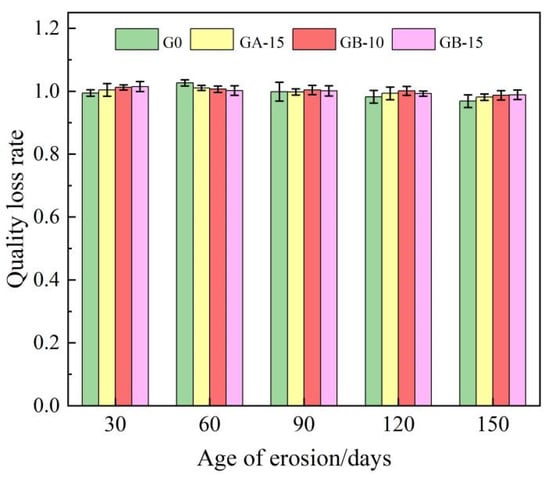 The mass loss rate test is the ratio of the mass in the same batch of test pieces soaked in tap water to the specified age and the mass soaked in a sodium sulfate solution at the specified age. The mass loss rate calculation is given in Equation (1).