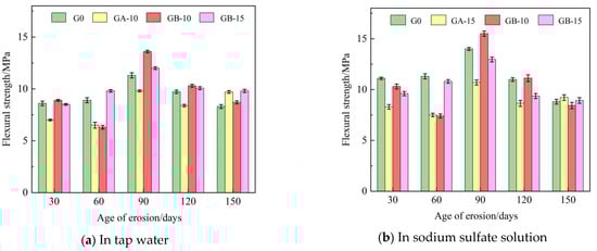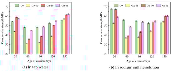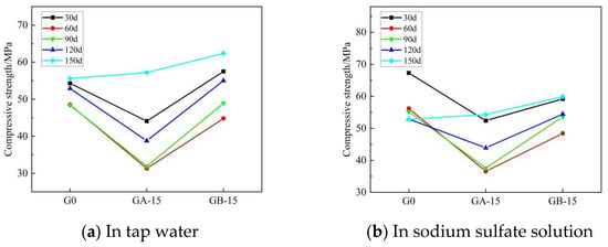 (2) With the addition of 15% 100–200 mesh glass powder, flexural and compressive strengths decrease significantly between 30 to 60 days of the initial erosion. However, the decrease in flexural strength from 90 to 150 days slows down by only 1% in tap water and 13.9% in sodium sulfate solution. In contrast, compressive strength rapidly increases by 79% in tap water and 44.5% in sodium sulfate solution. With the addition of 10% and 15% 200–500 mesh glass powder, the flexural strength declination slows, and the compressive strength declination becomes quicker in the early erosion stage of 30 to 60 days, whereas in the later erosion stage of 90 to 150 days, the flexural strength declination accelerates while the compressive strength increases.