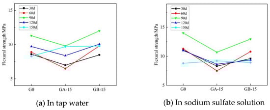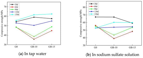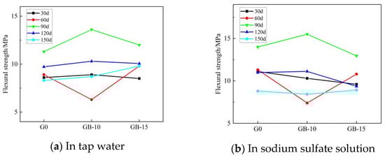 The compressive strength shows a pattern of decrease and then increase with age. Specifically, the compressive strength drops sharply from 30 to 90 days, by 27.7% in tap water and 28.2% in sodium sulfate solution. However, from 90 to 150 days, the compressive strength increases swiftly, 79% in tap water and 44.5% in sodium sulfate solution. This trend mainly occurs because when the particle size of the glass powder is less than 100 mesh, the early activity of the glass powder is low, thus leading to a decline in strength. As the age increases, the volcanic ash activity of the glass powder gradually rises, leading to dense hydrated calcium silicate crystals forming, which enhance the overall strength of the specimen and effectively fill the pore structure inside the system, increasing its resistance to the erosion effect of sulfate ions. When mixed with 200–500 mesh glass powder at a dosage of 10%, the flexural strength declines slowly from 30 to 60 days during the early erosion period, while the compressive strength decreases rapidly. However, in the late erosion period, from 90 to 150 days, the decline in flexural strength accelerates while the compressive strength increases. When 200–500 mesh glass powder with a dosage of 15% is mixed in, the development trend aligns with the specimens in the GB-10 group, although the overall effect is slightly less pronounced. When the particle size of the glass powder is less than 200 mesh, the finer the particle size of the glass powder cement sand, the larger the dosage, but the specimen’s resistance to sulfate erosion decreases. This is most effective when the dosage is 10%. Due to its larger contact area, the finer glass powder is more likely to react with the calcium hydroxide in cement hydration products, forming densely hydrated calcium silicate. As the age of erosion increases, this reaction becomes more efficient at compensating for the internal pores and micro-cracks caused by sulfate erosion. Therefore, an enhancement in compressive strength becomes apparent in the later stages of erosion.