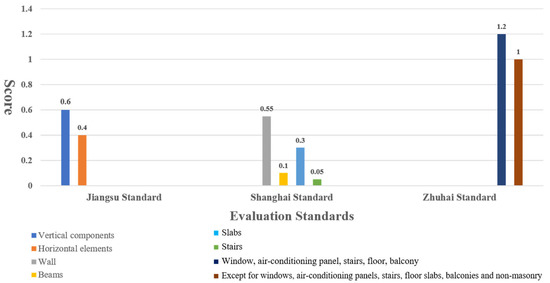 From Figure 2, it can be concluded that there are differences in the scope of the main structural components, the classification method, and the corresponding weights of different categories, which are mainly caused by the different focus of each standard with respect to the components. From the weights assigned, it can be seen that the Jiangsu Standard and Shanghai Standard focus on the prefabrication of vertical elements, while the Zhuhai Standard focuses more on the application of floating windows, air conditioning panels and other elements, in consideration of the fact that the use of floating windows and other elements will expand the space and increase the actual usable area of consumers, thus promoting the sales of buildings.