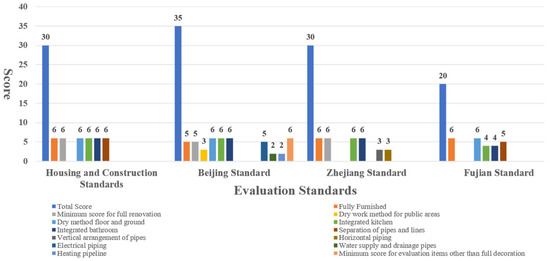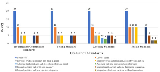 On the basis of Figure 3, it can be concluded that there are common features in the setting of the enclosure wall and internal partition wall, as well as the total score for each standard, and there are differences in the setting of the integration of technology into the enclosure wall and internal partition wall, which is mainly due to the differences in the level of economic development and the maturity of the technology processes in each region. The production cost of the factory integration of the decorative layer of the enclosure wall and the accuracy of the on-site construction in the region are necessarily high, and the integration of heat insulation into the internal partition wall rejects the score of rough rooms, but rough rooms are still the main sales channel in third- and fourth-tier cities; therefore, the Zhejiang Standard and Fujian Standard take into account the actual situation of the region in order to set refinements for the integrated technology in order to increase the promotion of prefabricated buildings.