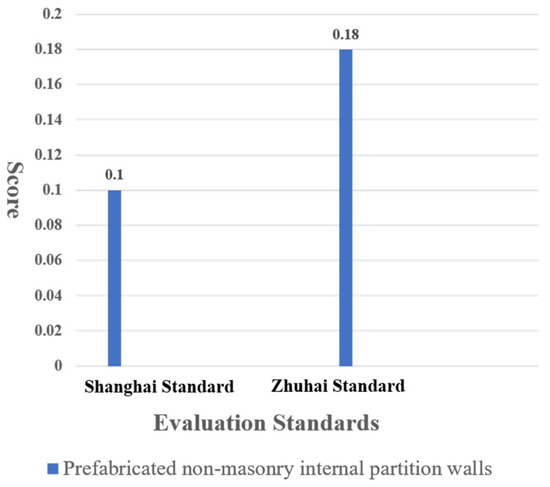 As an important component of the structural system in prefabricated buildings, enclosure walls and internal partition walls can improve the safety and overall performance of buildings, and they account for a large proportion in prefabricated buildings, and the scoring values of enclosure walls and internal partition walls should not be neglected [40]. For enclosure walls and internal partition walls, the evaluation criteria for the scoring method set specific scores for enclosure walls and internal partition walls and their corresponding integration, while weighting methods exhibit large differences in the calculation of enclosure wall and internal partition wall scores, as shown in Figure 3 and Figure 4.