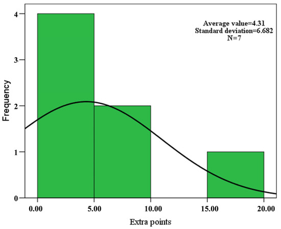 Table 3 shows results of the normality test and the one-sample t-test for the prefabricated building evaluation criteria. As can be seen from Table 3, the significance of the main structure, the enclosure and interior partition walls, the decoration and equipment piping, and the total score are all greater than 0.05, indicating that the data conform to a normal distribution, while the significance of the extra credit is lower than 0.05, indicating that the normal distribution of the data for the extra credit is not significant according to the Shapiro–Wilk test. In order to further explore the significance of the extra credit, a histogram is plotted for the extra credit data, as shown in Figure 8, below.
