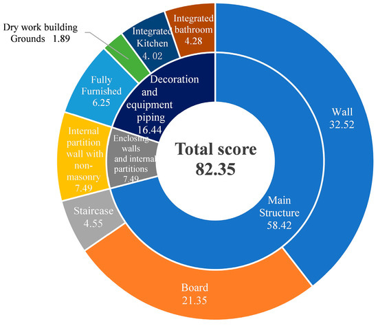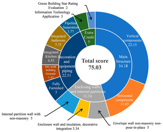 Figure 9, Figure 10, Figure 11, Figure 12, Figure 13, Figure 14 and Figure 15 present multi-layer circular pie charts of the specific scoring values of the evaluation criteria for prefabricated buildings, which are divided into three layers representing, from the inside to the outside, the total scoring value, the scoring value of the evaluation items, and the scoring value of the evaluation item refinement items, respectively. Taking the Housing and Construction Standard as an example, the total score value is 75.54 points, while the evaluation of the main structure, the decoration and equipment piping, and enclosure walls and internal partition walls scored values of 35.21 points, 27.29 points, and 13.34 points, respectively. For the main structure, the refinement items corresponding to vertical components and horizontal components scored 23.15 points and 12.06 points, respectively. The other criteria are presented similarly. From the analysis of the detailed scores of the above evaluation criteria, it can be seen that the vertical members and the internal partition walls in the main structure account for the largest proportion of the total score, while the scores for the green building rating and application of BIM information technology account for the highest proportion of extra credit; meanwhile, the decoration and equipment piping scores were more evenly split. Therefore, for the prefabricated building to obtain a higher prefabrication rate, the application rate of vertical members and internal partition walls should be focused on more, as well as the application of information technology and green technology.