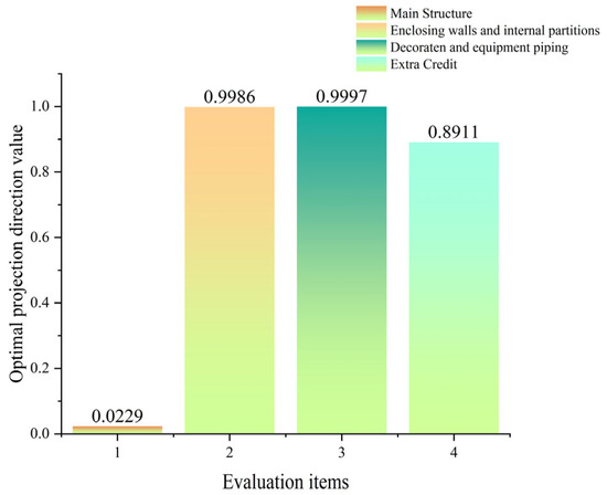 In Figure 17, the horizontal coordinate represents the evaluation items in the evaluation standards for prefabricated buildings, and the vertical coordinate represents the value of the optimal projection direction vector, from which it can be seen that the optimal projection direction vector of the enclosure wall and the internal partition wall is 0.9986 at its maximum, and the optimal projection direction vector of the main structure is 0.0229 at its minimum. The size of the best projection direction vector reflects the degree of influence of a given evaluation item for prefabricated buildings on the total score; thus, it can be judged that the enclosure wall and internal partition wall have the greatest influence on the total score, and the main structure has the least influence on the total score. This is mainly due to the fact that the evaluation criteria for prefabricated buildings usually focus on overall performance and quality, and that enclosure walls and internal partition walls have a greater impact on the indicators designating the safety, comfort, and energy efficiency of the building. Therefore, in the evaluation criteria, enclosure walls and internal partition walls assume a greater functional role in prefabricated buildings. In contrast, the main structure has less influence on the total score of the evaluation criteria for prefabricated buildings, mainly because the main structure is mainly related to the overall stability and load-bearing capacity of the building, and is less related to the overall performance of the prefabricated building. Although the main structure plays a load-bearing role in prefabricated buildings, other functional aspects are mainly considered in the evaluation criteria.