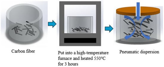 To mitigate this interference, the CF was placed in a crucible and subjected to a temperature of 550 °C for a duration of 3 h to remove the sizing [63]. Upon completion of this process, the CF was dispersed by utilizing a pneumatic dispersion method, as illustrated in Figure 1.