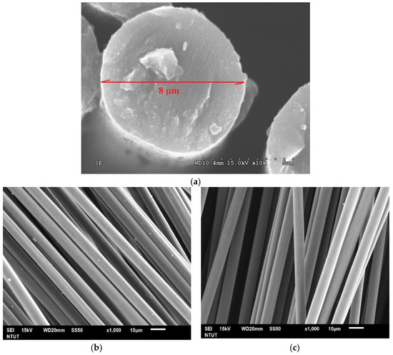 In the present study, a scanning electron microscope (SEM, JEOL, JSM-6510LV, Tokyo, Japan) was utilized to examine the fiber surface imagery. Figure 2a depicts the cross-sectional view of the original carbon fiber, having a diameter of 8.0 μm. Meanwhile, Figure 2b,c provide SEM images of the original chopped CF and the sizing-removed chopped CF, respectively, both captured at a 1000-fold magnification.