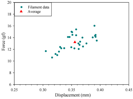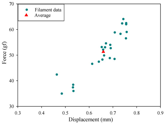 The single filament tensile strength of the Kevlar fiber was also conducted per ASTM D3822-07 [64]. The single filament tensile test results of the Kevlar fiber showed that the average tensile force was 51.27 ± 8.54 gf and the average fracture displacement was 0.660 ± 0.087 mm. Figure 5 illustrates the failure force and displacement for the Kevlar fiber filaments.
