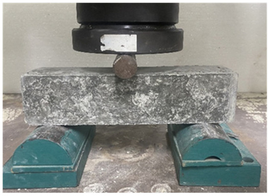 The universal testing machine was again used to determine the flexural strength of the control, KFRC, CFRC, and HFRC as per ASTM C293-02 [68]. The three-point bending test was conducted on a specimen with dimensions of 28 cm × 7 cm × 7 cm (length × width × height) at a loading rate of 20 kPa/s, as shown in Figure 6. The rupture modulus or flexural strength of the specimen was calculated by using the formula below: