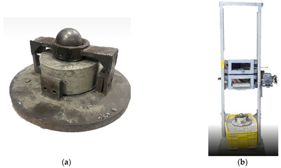 The impact test specimen, measuring ϕ 15.2 cm × 6.35 cm, was placed on a fixture with a hardened steel ball, as depicted in Figure 7a. The impact test was conducted following the guidelines of ACI 544.2R-89T [70] by using an impact testing machine (SP-006, Shengpeng, Yunlin, Taiwan). The specimen was positioned in a fixture and subsequently set on a sandbox’s top, as displayed in Figure 7b. The potential energy (E) can be computed as E = m × g × h, where m stands for the hammer’s mass (kg), g stands for the gravitational acceleration (m/s2), and h stands for the hammer’s setting height (m). The impact energies tested for both the control and HFRC specimens varied between 100 J and 300 J.