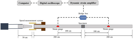 During the SHPB examination, a striker bar was accelerated from the gas pressure chamber under a prescribed pressure, which impacted the incident bar and generated stress waves. These stress waves propagated from the incident bar to the specimen’s interface, leading to the creation of reflective and transmissive waves. Strain gauges were attached to the incident bar and transmission bar to record the strain–time signals of the incident wave , reflected wave , and transmitted wave . The specimen’s stress , strain , and strain rate (t) obtained from the three-wave method are represented as follows [71]: