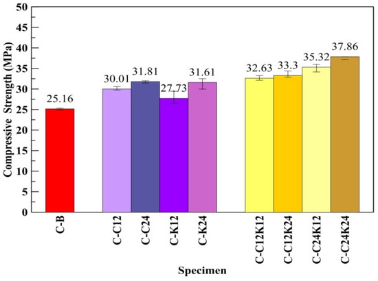 Table 3 presents the compressive strengths of the C-C12, C-C24, C-K12, and C-K24 specimens. The average compressive strengths of these specimens were 30.01 MPa, 31.81 MPa, 27.73 MPa, and 31.49 MPa, respectively. Compared to the benchmark specimen, the average compressive strengths increased by 19.3%, 26.4%, 10.2%, and 25.2%, respectively.