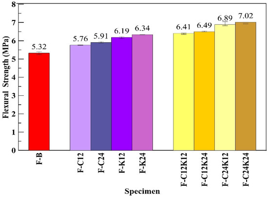 The flexural strengths of the F-C12, F-C24, F-K12, and F-K24 specimens are detailed in Table 5. They manifested average flexural strengths of 5.76 MPa, 5.91 MPa, 6.19 MPa, and 6.34 MPa, respectively. When compared to the benchmark specimen, these averages demonstrate enhancements in the flexural strength by 8.3%, 11.0%, 16.2%, and 19.0%, respectively.