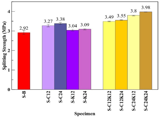Table 8 presents the splitting strengths of the S-C12K12, S-C12K24, S-C24K12, and S-C24K24 specimens. The average splitting strengths of these specimens were 3.49 MPa, 3.55 MPa, 3.80 MPa, and 3.99 MPa, respectively. Compared to the benchmark specimen, the average splitting strengths increased by 19.5%, 21.7%, 30.3%, and 36.5%, respectively.