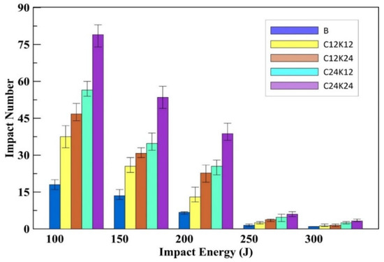 Based on the previous test results, the HFRC exhibited greater strength compared to the single-type FRC. Therefore, the impact test was conducted on the HFRC and benchmark specimens by using impact energies of 100 J, 150 J, 200 J, 250 J, and 300 J. Table 9 presents the impact energies and corresponding impact numbers for the HFRC and benchmark specimens. For example, at 100 J of impact energy, the average impact numbers for the benchmark, I-12K12, I-C12K24, I-C24K12, and I-C24K24 HFRC specimens were 18.0, 37.5, 46.8, 56.5, and 79.0, respectively.