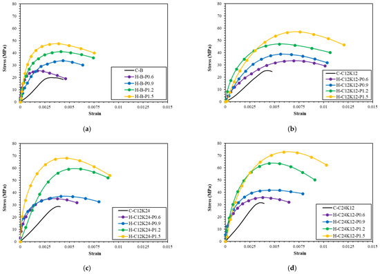 Figure 13. Stress–strain relationship from SHPB test: (a) benchmark; (b) specimen C12K12; (c) specimen C12K24; (d) specimen C24K12.