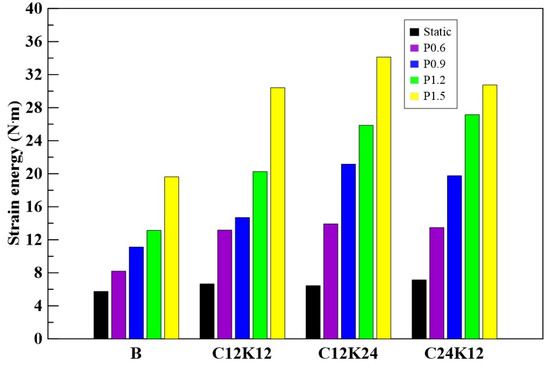 The strain energy, which encapsulates the energy stored within a specimen, is calculated by determining the integral of the area beneath the stress–strain curve and subsequently multiplying this value by the specimen’s volume. Figure 14 displays a bar chart of the strain energy, indicating a higher concentration of strain energy in the HFRC specimens composed of 12 mm carbon fiber and 24 mm Kevlar fiber relative to the other tested samples.