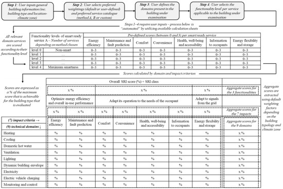 The concept of SRI was introduced in the revised Energy Performance of Buildings Directive (EPBD) [23] in 2018 to provide a common EU scheme for assessing the smart readiness of buildings. Following regulations [24,25] and technical studies [26] launched the current SRI testing phase, according to which EU countries can implement, optionally for the moment, this rating scheme. The SRI assesses the ability of a building to sense, interpret, communicate, and actively control in an efficient manner the operation of technical building systems optimizing energy efficiency and overall performance, adapting to signals from the grid (energy flexibility), and responding to the needs of the building occupants [27]. The methodology for calculating the SRI is described in detail [26] and summarized in Figure 1. The final SRI rating depends on the examined building’s ability to facilitate “smart-ready” services which are included in a “smart-ready service catalogue”, addressing nine (9) technical domains: (1) heating; (2) domestic hot water; (3) cooling; (4) ventilation; (5) lighting; (6) dynamic building envelope; (7) electricity; (8) electric vehicle charging; and (9) monitoring and control.