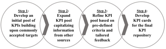 The proposed methodology for extracting KPIs is based on four (4) major consecutive steps, which ensure that significant aspects related to the evaluation of deep renovation activities as imposed by internal (e.g., own goals, stakeholder needs) and external (e.g., strategic plans, initiatives, scientific literature) sources are both considered. These four steps are summarized in Figure 2.