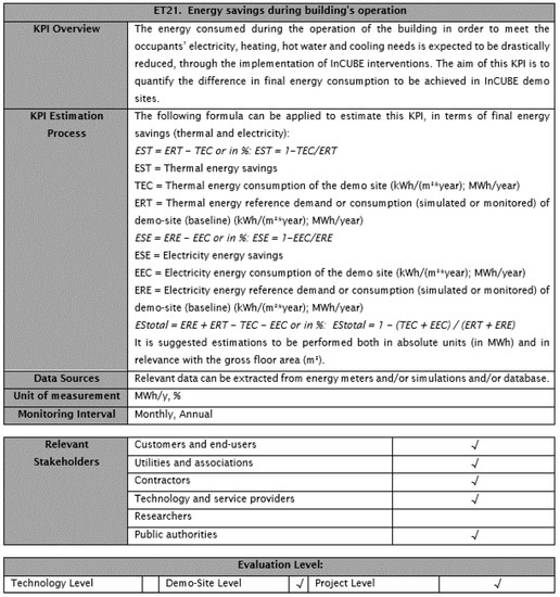 The methodology described in Section 3 has been implemented in the Horizon EU project InCUBE for the determination of the final KPI repository upon which the project is going to be evaluated. InCUBE brings together 23 high-profile partners and two affiliated entities from seven EU countries, envisioning unleashing the EU renovation wave through cutting-edge, standardized, lean integrated processes based on four key pillars of innovation: