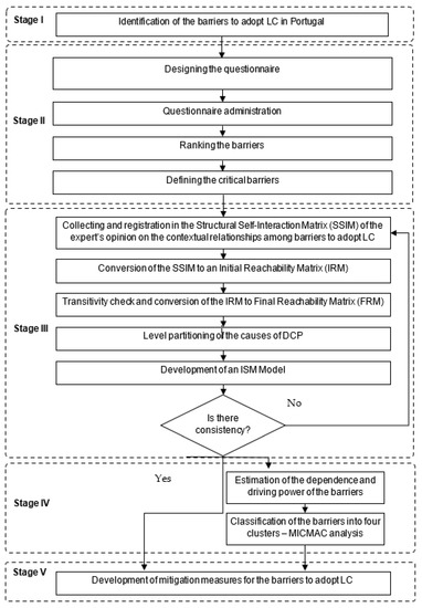 To analyse the barriers, a survey was conducted with responses from 99 workers in the construction industry in Portugal. The results were considered valid and, from the 27 original barriers, 15 were considered critical. This list included the following barriers: a lack of adequate Lean awareness and understanding, inadequate delivery performance and material delivery delays, a lack of support and commitment from top management, excessive bureaucracy and inflexible licensing and approvals, a lack of communication and transparency between stakeholders, the absence of long-term planning, a lack of organizational communication, a lack of prefabrication and the limited usage of off-site construction techniques, management resistance to change, unsuitable organizational structure, a lack of identification and control of waste in the project and in the company, a lack of performance measurement systems, employees’ aversion to change and fear of new procedures, a lack of planning for quality, and not recognizing financial advantage. These results were compared with the articles referred to in the literature review and the results were relatively similar given the fact that it is expected that different countries have different perspectives on the barriers and that most studies were from developing countries that have less in common with Portugal than more developed countries. Since knowing the critical barriers was not enough to successfully propose mitigation measures, another two methods were applied, the ISM approach and the MICMAC analysis, which help understand the relations between the different barriers and which barriers are the root cause of the lack of application of LC in Portugal.