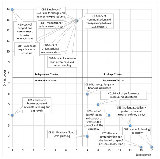 Those ranks divide the critical barriers into four groups: autonomous, dependent, linkage, and independent [26,27]. The autonomous group includes barriers with weak dependency and weak driver power. The dependent group includes barriers with high dependency and a low driving force. The linkage group includes barriers with high dependency and a high driving force. Finally, the independent group includes barriers with low dependency but a high driving force [15].