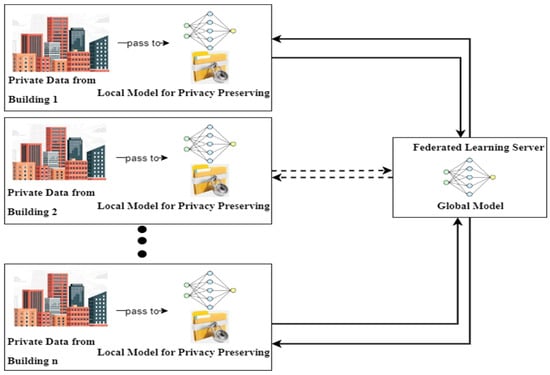 The mathematical modelling of federated learning is the maintopicof this section. A distributed machine learning paradigm known as federated learning (FL) makes it possible to train neural networks (NNs) and conduct data analysis directly on the data storage [,]. In FL, the neural network is updated using result factors like NN weights to construct a mixed analytical model. FL devices do not store data centrally []. The three main parts of every FL system are the server, the communication framework, and the consumers. While the whole dataset (DSN = DS1 + DS2 +… + DSp) is referred to as DSN, FL needs the usage of individual client data sets (DS1, DS2,…, DSp) to train a single machine learning model. To train a deep learning model using a conventional distributed learning method, all distributed datasets (DNs) are combined into a single dataset. In FL, however, each client’s data (DSi) is separately trained, and the resulting models work together without transferring any DSi to the server (SV) or the other clients (Mi). In this case, categorical cross entropy loss (L) from Equation (1) is used as the basis for classification.