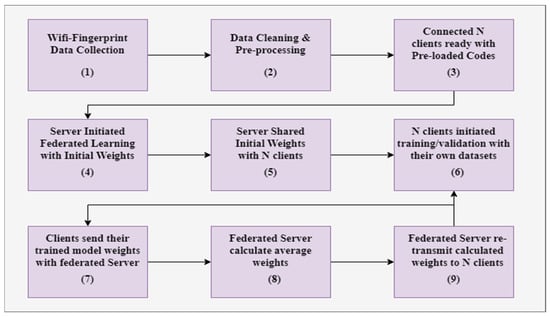 This standard provides guidelines for the use of Wi-Fi technology in indoor environments, ensuring compatibility and accuracy in the fingerprinting process. Additionally, the tabulated specifications include details on signal strength, signal-to-noise ratio, and other parameters that are crucial for accurately determining a device’s location within the indoor space. The proposed architecture for f-ILC (federated indoor localization classification), which is shown in Figure 1, comprises the layers. A client–server architecture was necessary for the suggested framework for federated machine learning or deep learning, with each end utilizing its own code to carry out prescribed tasks. One server and N clients, each running their own code, made up a federated cluster. The suggested federated learning architecture for indoor localization categorization was implemented using two Python programming libraries, Keras and Tensorflow. Since each N-client network node has its own processing and storage unit, each might use its own structured data to generate the training model and weights. The remote server processed federated global weights from N-client trained models. In contrast to traditional distributed ML and DL frameworks, the suggested federated architecture guaranteed client data privacy by just transmitting training weights between client and server. This also reduced processing latency.