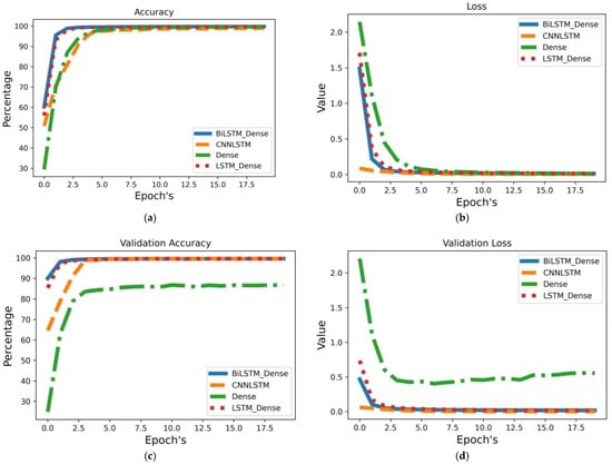 To categorize the indoor localization in this case, conventional deep learning algorithms such as CNN-LSTM, Bi LSTM, and DenseNet were used [,]. LSTM, CNN-LSTM, Bi LSTM, and DenseNet models were trained and verified over the course of 50 epochs. We specified, 64 for the batch size, 50 for the epochs, and 0.001 for the learning rate in the hyper parameters.