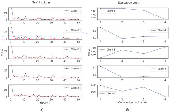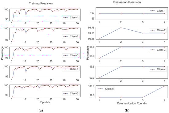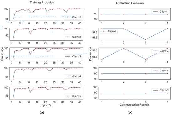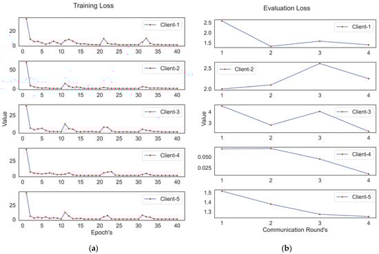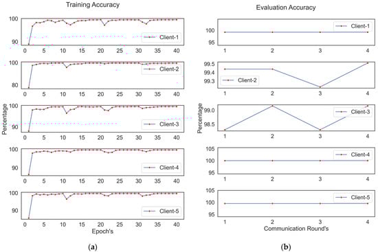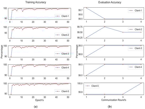 In this section, the proposed FL architecture were analyzed on the basis of non-IID data [,]. Violating any of the rules mentioned in Section 4.3.1 implies a non-IID context. Here, in this work, data was unequally distributed among all five nodes for unbalanced training and testing. The unequally distributed dataset was considered to analyze the resultant training of models. Even with unbalanced non-IID data, all individual clients resulted in balanced and nearly equal outcomes in terms of training and validation accuracy with minimum losses as shown in Figure 8, Figure 9, Figure 10 and Figure 11.