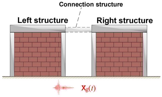 where ; is the external seismic excitation frequency; is the amplitude of the transfer function of the “left structure” and “right structure” in the adjacent building structure, respectively. is the transfer function of the “left structure” and “right structure” in the two vibration control systems, respectively.