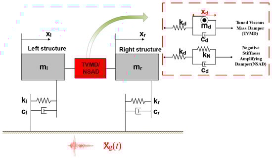 Two single-story adjacent structure building models are shown in Figure 1. In order to facilitate calculation and analysis, the architectural model is simplified, as shown in Figure 2. This section will achieve the effect of vibration reduction through the appropriate combination of stiffness spring, viscous damper, mass block and negative stiffness element. As shown in Figure 2, additional mass and additional negative stiffness are used to achieve vibration reduction. In TVMD control systems and NSAD control systems, the inertial mass and NSD will amplify the motion of the viscous damper. Due to the presence of the connecting spring , the amplified deformation is absorbed by spring deformation. Therefore, the total deformation of the additional device is not magnified. The structure of the TVMD control system is shown in Figure 2. The TVMD control system is configured by connecting the inertial mass and the viscous damper in parallel, supporting the combination of the two frames with the horizontal stiffness of . Similarly, replacing the inertial mass with the negative stiffness will enable the configuration of the NSAD control system (see Figure 2).