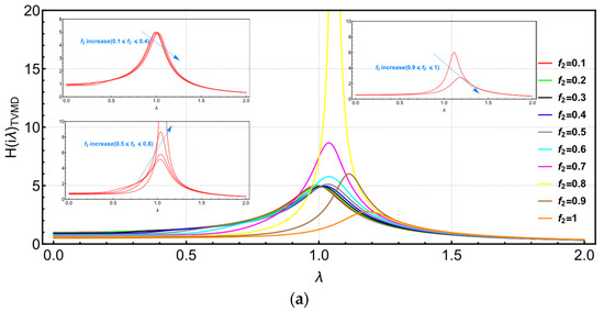 - In the TVMD vibration control system, the maximum peak value appears on the “left structure” when parameter . When parameter , the transfer function image has obvious troughs. As the parameter increases, the peak value of the transfer function on the “left structure” decreases slowly, and the peak value of the transfer function on the right of the structure increases slowly.