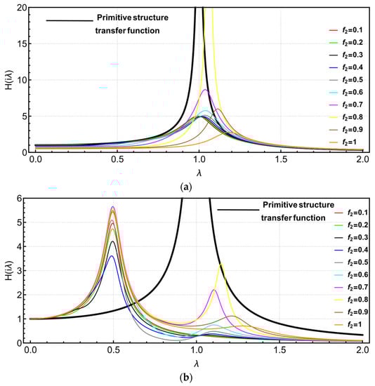 The comparison between the transfer function of parameter in the TVMD vibration control system and the original structure transfer function. (a) compared to ; (b) compared to .