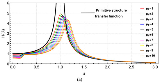 Figure 5 draws the transfer function images of “left structure” and “right structure” in the TVMD vibration control system with respect to parameter . In Figure 5a, as the mass ratio increases linearly, the peak value of the transfer function decreases approximately linearly. Similarly, in Figure 6a, the amplitude of the transfer function of the “left structure” in the TVMD vibration control system is effectively reduced, and the vibration is effectively controlled.
