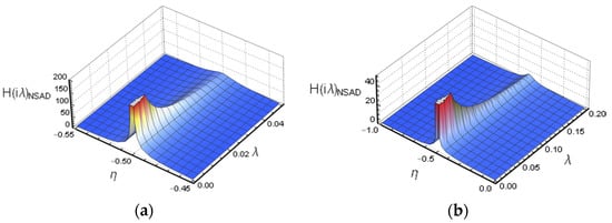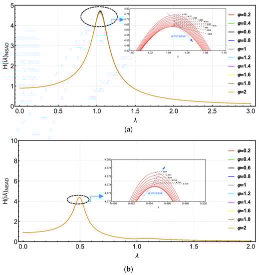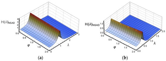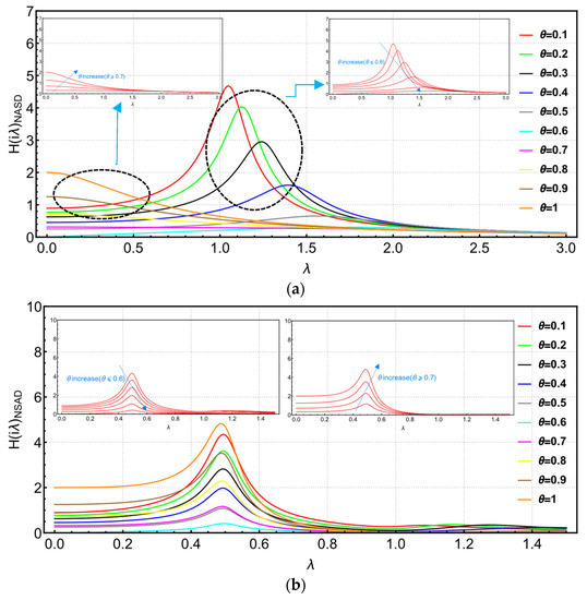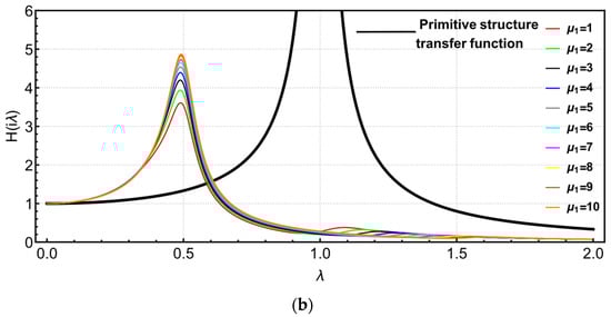 Figure 11b shows the transfer function image of the “right structure” in the NSAD vibration control system. For the “right structure”, the parameter is also discussed in two intervals. The peak value of transfer function to decreases gradually when . When , the transfer function begins to increase gradually. In Figure 12b, the peak value of the transfer function of the “right structure” in the NSAD vibration control system is also effectively reduced compared with the “right structure” in the original uncontrolled system.
