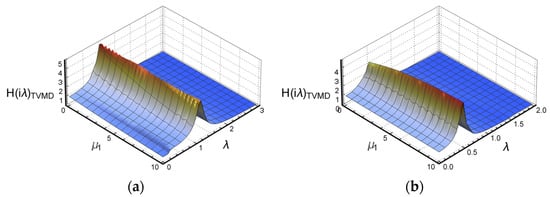 Figure 7a draws a three-dimensional graph of the “left structure” with respect to parameters and . It can be seen from the curve in Figure 7a that the law of increase and decrease of the peak value of the two-dimensional curve of parameter is consistent with the law summarized in Figure 3a. Moreover, the peak value of the transfer function reaches its maximum value when . The transfer function of the “left structure” in the TVMD vibration control system is significantly reduced compared with the “left structure” in the non-control system. Figure 7b draws a three-dimensional graph of the “right structure” with respect to the parameters “right structure” and . When or so, the peak value of the transfer function has an obvious trough. The vibration of the “right structure” is controlled to the greatest extent. When , the transfer function begins to show obvious double peaks. The transfer function of the “right structure” in the TVMD vibration control system is significantly reduced compared with the right structure in the non-control system. It can be observed in Figure 8a that the peak value of the transfer function curve continues to decrease with a small amplitude. It can also be observed from Figure 8b that when , the peak growth rate of the transfer function is faster, and when , the peak growth rate of the transfer function begins to slow down.