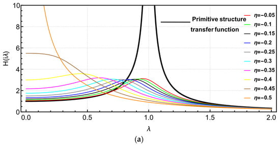 Figure 9 plots the transfer function of the “left structure” and the “right structure” with respect to the negative stiffness ratio in the NSAD vibration control system. It is found that the negative stiffness ratio can be divided into and . Figure 9a, b plots the transfer function image of the “left structure” in the NSAD vibration control system. See Figure 9a. With the negative stiffness decreasing compared with , the peak value of the transfer function of the “left structure” decreases first and then increases. The peak value of the transfer function reaches its minimum value when . This can be observed in Figure 9b. When , the peak value of the transfer function decreases continuously. The smaller the negative stiffness is than , the smaller the reduction in the peak value of the transfer function. In Figure 10a,b, it can be observed that the peak value of the transfer function of the “left structure” is effectively reduced under the control system.