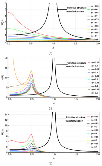 - In the NSAD vibration control system, the peaks of the “left structure” and the “right structure” transfer functions increase abruptly when . At , the peak value of the transfer function increases continuously. At , the peak value of the transfer function decreases continuously. When parameter , the transfer function image has obvious troughs. The parameter has little influence on the structure and fails to make the transfer function curve of the structure fluctuate significantly.