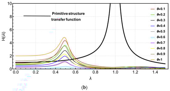 Figure 3b shows the transfer function image of the “right structure” in the TVMD vibration control system. In the figure, it can be clearly observed that the transfer function of the “right structure” has obvious double peaks. Additionally, parameter is divided into three interval segments. In the interval , the peak value of the transfer function also decreases with the linear increase of . With the linear increase of parameter in the interval , the amplitudes at both peaks of the transfer function begin to increase. In the interval , with the linear increase of parameter , the amplitude at the double crest of the transfer function decreases continuously. The law of the transfer function of the “right structure” with respect to the parameter is the same as that of the “left structure”. In Figure 4b, the amplitude of the transfer function of the uncontrolled system is also larger than that of the control system.